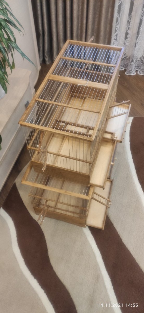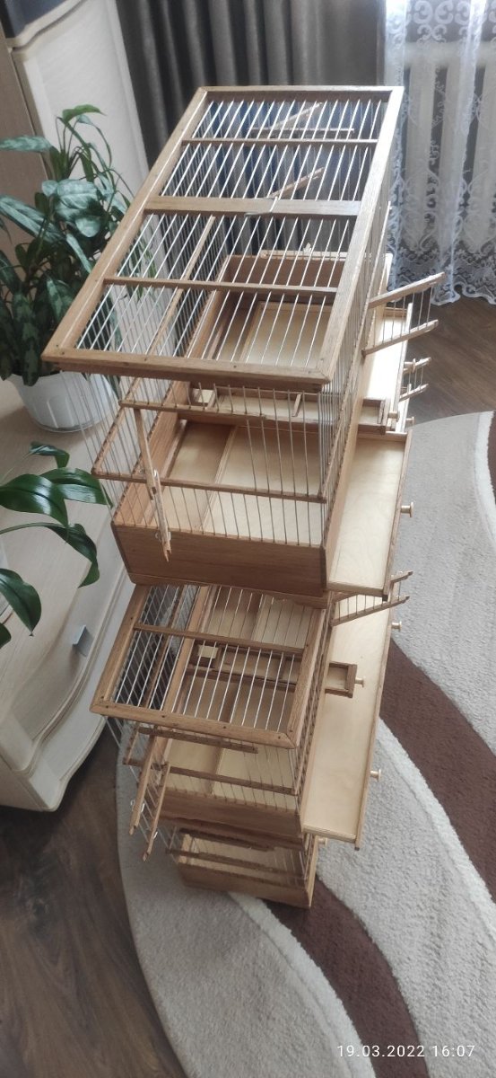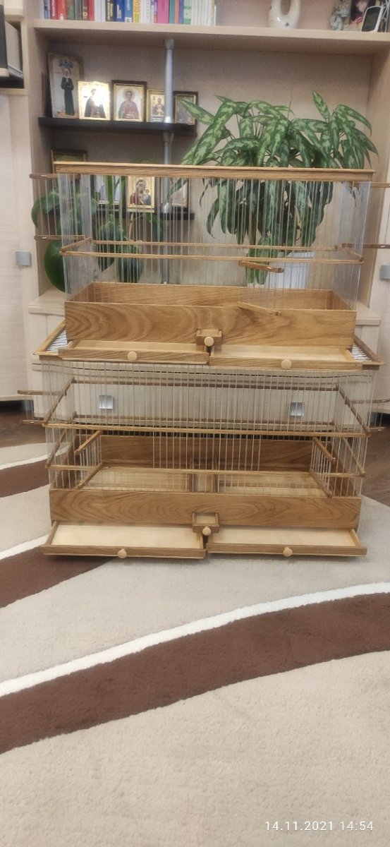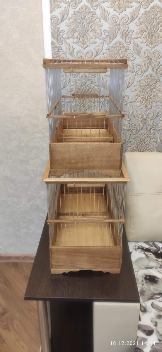 Две большего размера клетки сделаны в Беларусь Одна клетка размером 750×360×480мм. Клетка с съемной перегородкой посередине. Одна перегородка спицы, вторая глухая. Перегородки взаимозаменяемые. В клетке две кормушки и поддон состоит из двух половин. Клетка имеет три яруса. С фронта две двери в среднем ярусе и две двери по бокам тоже в среднем ярусе. Клетка тоже с карнизом.Спицы пищевая дюраль диаметром 1,6мм. Фанера влагостойкая, дерево дуб. Клетка пропитана по желанию заказчика маслом. Вторая клетка в Беларусь размер 600×270×380мм. все тоже самое только без перегородки, два яруса, три дверцы, и одна кормушка. Тоже пропитана маслом.