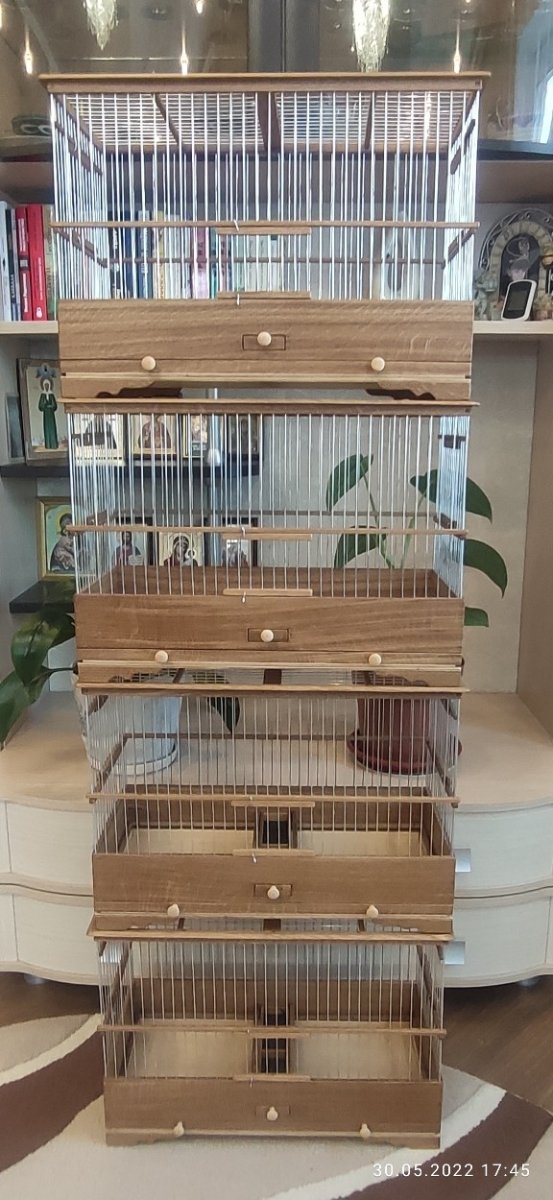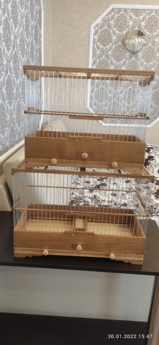 Выставляю на обозрение и обсуждение 4 клетки. Две одинаковые сделаны в Екатеринбург, размер 500×240×330мм. Дерево дуб, спицы пищевая дюраль диаметром 1,6мм, фанера влагостойкая. Клетки с карнизом имеют по 3 дверцы одна в нижнем ярусе и две по бокам в верхнем ярусе. Кормушки по центру. Дно целое. Клетки пропитаны Пинотексом и покрыты в два слоя лаком для яхт.