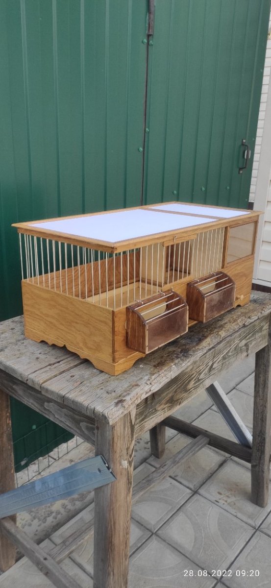 Здравствуйте!Вот опять смастерил две клетки!Теперь поедут в Москву.Одна клетка размером 600×300×360мм для реполова.Клетка с прямым верхом и карнизом.Дерево дуб,спицы пищевая дюраль диаметром 1,6мм.В клетке два выдвижных дна и кормушка по центру Три дверцы ,по фасаду одна распорная в верхнем ярусе,одна распорная справа и одна дверца с левой стороны съмная по просьбе заказчика.Клетка пропитана Пинотексом и покрыта в два слоя лаком для яхт.Вторая клетка для полевого жаворонка с отсеком или как его называют баней для песка.Размер