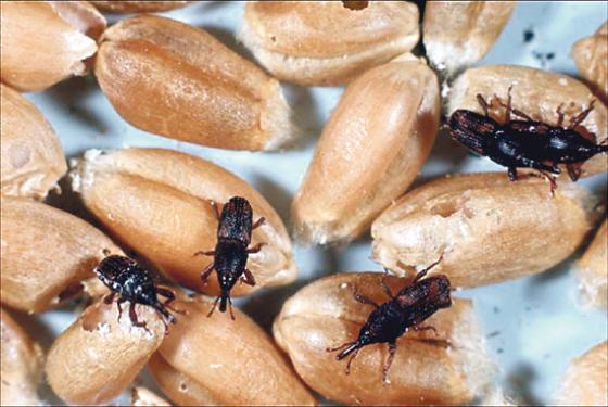 Второй возможный кандидат - долгоносик... Вредитель работает исключительно по зерну и крови на нем вроде нет.