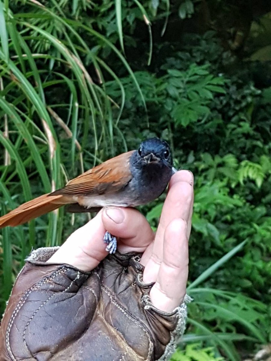 Эта встреча состоялась в сентябре на северо-западе Вьетнама на крутом склоне по горной дороге на высоте около 900 м. Птицы были достаточно заметны, их рыжий цвет ярко выделялся на фоне зелени джунглей. Когда они прыгали и перепархивали с ветки на ветку длинный хвост всегда был на виду и не давал потерять птицу из вида. Возможно коллеги из Средней Азии могут сравнить своих райских птиц с представленными фотографиями по размеру и цвету, сам я встречал их не часто.Пойманный экземпляр был полностью перелинявшим,имел жесткое гладкое перо, на голове и спине - с легким блеском и переливом. Птица активно сопротивлялась, возмущалась,щелкая при этом клювом; хохол плотно прижимала к голове. После фотосессии еще раз "цапнув" меня за руку, благополучно скрылась в густой зелени.