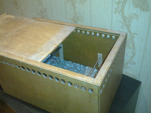Боковые стенки закрыты - пластик или фанера. Имеется решетчатый пол и выдвижное дно. Верх затянут мелкой светлой прозрачной сетчатой материей для контроля и доступа света.В одном торце - подъемная дверка, спецкормушка и автоматическая поилка.