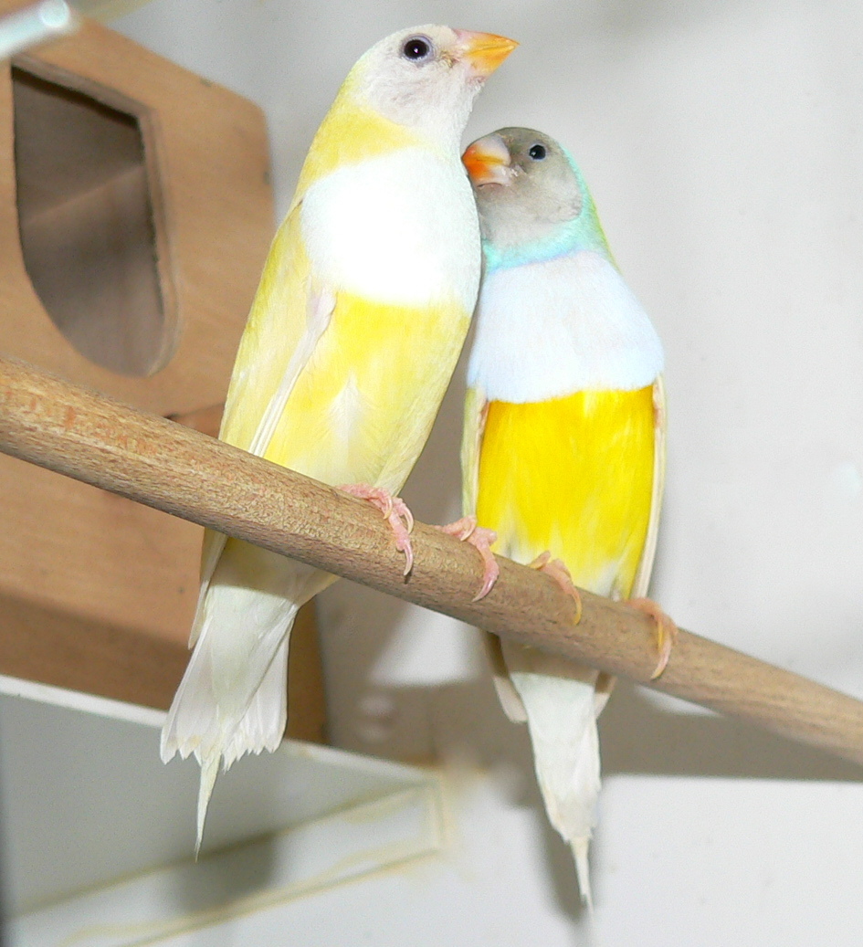 Молодые гульды от родителей дикого типа окраски полиняли отчасти, одна птица оказалась молодым синим самцом, одна самка имеет на границе желтого и сиреневого цвета пучки синих перьев, часть пигмента, как я понимаю, ушла и на желтые перья, отчего они кажутся грязными. :D