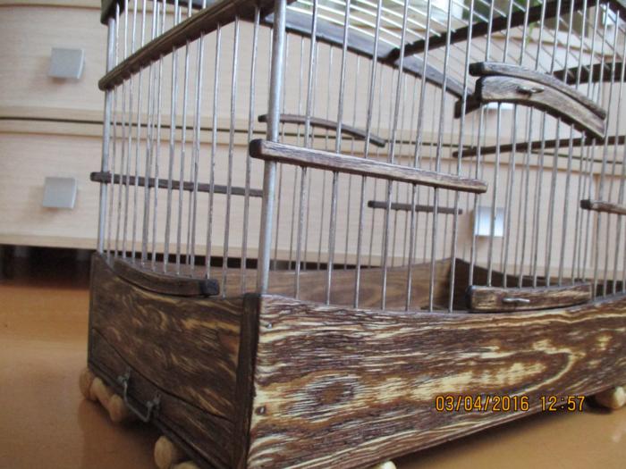 Собственноручная подделка под выставочные клетки на различных зарубежных выставках. Это не окончательный вид клетки. Окончательно их оформил "черный низ - белый верх", т.е. внутри выкрасил парой слоев обычной масляной белой краской, а снаружи покрыл морилкой и парой слоев лака. Вариант на фото больший, под травяных чуть меньшего размера. А вот точный размер не помню.