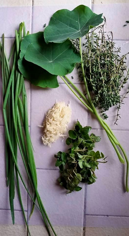 1. Очистить и нарезать пару больших зубков/стеблей чеснока. После чего, оставить их отдохнуть в течение нескольких минут, чтобы сформировалось множество аллицина. 2. В то время, как чеснок совершает свою магию, нужно выйти на улицу и совершить набег на травяную грядку. Собрать большой смешанный букет свежих трав: розмарин, тимьян, орегано, карпобротус съедобный, тысячелистник, [url=http://gularis.com/forums/viewtopic.php?f=18&t=761]бархатцы[/url], [url=http://gularis.com/forums/viewtopic.php?f=18&t=757]календула[/url], чертополох, базилик, [url=http://gularis.com/forums/viewtopic.php?f=18&t=765]настурция[/url], дикий чеснок и еще чего-нибудь из избранного... 3. К благоухающему чесноку добавить полную (с горкой!) пригоршню очищенных семян подсолнечника. Хотя, нечищеные семечки тоже блюда вероятно не испортят? Мелко подробить семена, постепенно и равномерно смешивая их с чесноком. 4. Нарезать свежий сбор трав и хорошо промешать с подсолнечно-чесночной смесью. 5. Добавить 2,5 мл масла, например кокосового, конопляного, льняного или кедрового. Возможен и Ваш [url=http://gularis.com/forums/viewtopic.php?f=7&t=685]вариант растительного масла[/url]. 6. Добавить большую, полную пригоршню сухого и рассыпчатого яичного омлета, приготовленного на небольшом количестве кокосового масла. (Автор рецепта делает омлет сразу на 5 дней и держит его в холодильнике). 7. Добавить две пригоршни ростков [url=http://gularis.com/forums/viewtopic.php?f=5&t=447]маш[/url]. 8. Добавить одну пригоршню пророщенной чечевицы. 9. Добавить тертую морковь, свеклу или батат. 10. Добавить 2- 3 чашки пророщенного зерна (просо, канареечник, конопля, сорго, [url=http://gularis.com/forums/viewtopic.php?f=5&t=5]нигер[/url], [url=http://gularis.com/forums/viewtopic.php?f=5&t=447]люцерна[/url], ячмень, кунжут, лен, [url=http://gularis.com/forums/viewtopic.php?f=5&t=447]пажитник[/url], анис и т.п.)…[attachment=2]12360192_970816822979514_9045667075755838508_n.jpg[/attachment] [attachment=1]12345582_970816872979509_1214413959263034676_n.jpg[/attachment] [attachment=0]12311043_970816909646172_5741618648066889198_n.jpg[/attachment]