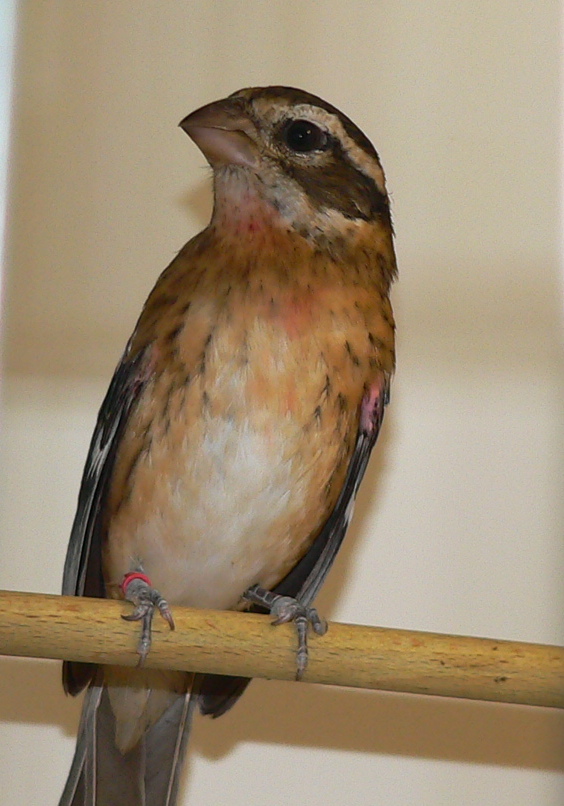 Есть один интересный момент. Птенец уехал к моему другу в Саратов и после первой птенцовой линьки начал набирать цвет, не такой яркий как у отца, но красный «галстук» виден очень отчетливо, хотя в литературе пишут, что взрослый наряд птенцы набирают на второй год жизни.