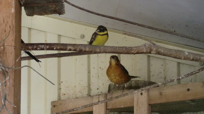 Вольеры открытые, находятся на приусадебных участках. В одном фасад закрывается листом поликарбоната, а в глубокие редкие у нас морозы до -25ºС, включаются тепловентилятор и ночью горит тусклый свет. В другом закрыватся дверь в зимнюю часть деревянного помещения с обогревом маслянного радиатора. Птицы получают возможность вылетать в специальное отверстие в открытую, зарешёченную часть и залетать обратно. Новогодние морозы - 25ºС, длившиеся неделю, перенесли (у обоих заводчиков) даже белопоясничные шамы, хотя вода на полу подмерзала.