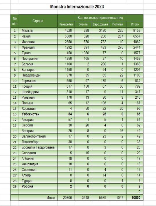 Всего, в ходе Международной выставки, с официально оформленным сертификатом, было экспортировано 30880 птиц.