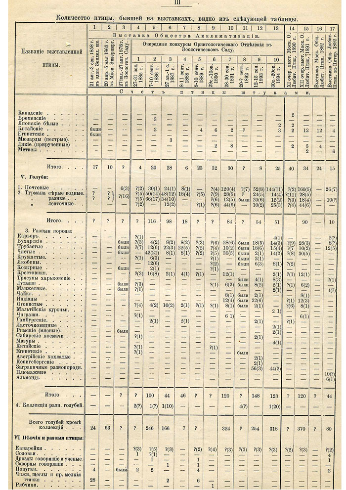 Для лучшего понимания цифр в таблице выдержка из Обзора: "В таблице поставлены везде вопросительные знаки, когда известно, что птица какой-либо породы была на выставке, но неизвестно, в каком количестве она была представлена. В отделе голубей цифры, стоящие в скобках, означают количество экспонентов, выставивших данный сорт голубей. Около цифры, относящейся к коллекциям, поставленные в скобках цифры означают количество птицы бывшей в коллекции."