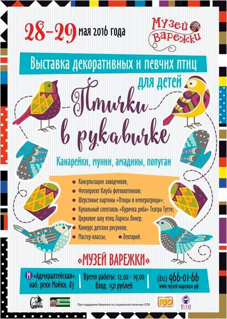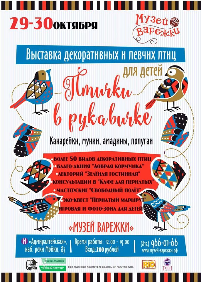 [i]Выставка станет необычным – крылатым подарком для больших и маленьких жителей Санкт-Петербурга ко Дню города. Гости увидят более десятка видов декоративных и певчих птиц: канарейки, попугаи, амадины, астрильды, мунии и другие. Выставку также дополнят необычные арт-птицы. На выставке любой желающий сможет не только полюбоваться райскими птичками, но и получить бесплатную консультацию от заводчиков птиц, орнитологов и ветеринаров! И, конечно, гостей ждет насыщенная развлекательная и культурная программа![/i] [u]В программе:[/u] - экспозиция живых декоративных и певчих птичек; - бесплатные консультации орнитолога и специалиста по кормлению птиц; - встречи с ведущими заводчиками декоративных и певчих птиц; - лекции и семинары от ведущих орнитологов и представителей крупнейших приютов для птиц; - творческие мастерские; - розыгрыш призов от партнеров выставки. [u]Партнеры выставки:[/u] Союз охраны птиц России Благотворительный фонд "Центр реабилитации и реинтродукции диких животных "Сирин" Госпиталь птиц «Зеленый попугай» Компания Mealberry (продукция для домашних животных)[attachment=0]Музей-варежки-2016.jpg[/attachment]
