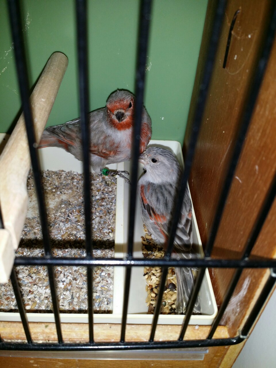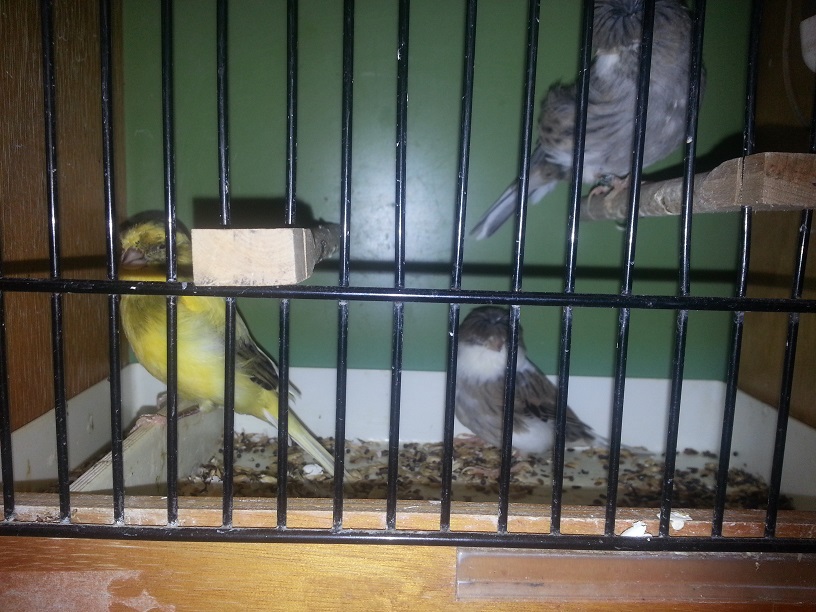 Справа -гибрид огненного чижа<br />и канарейки,самка.