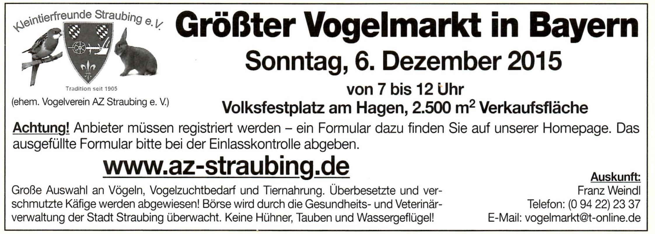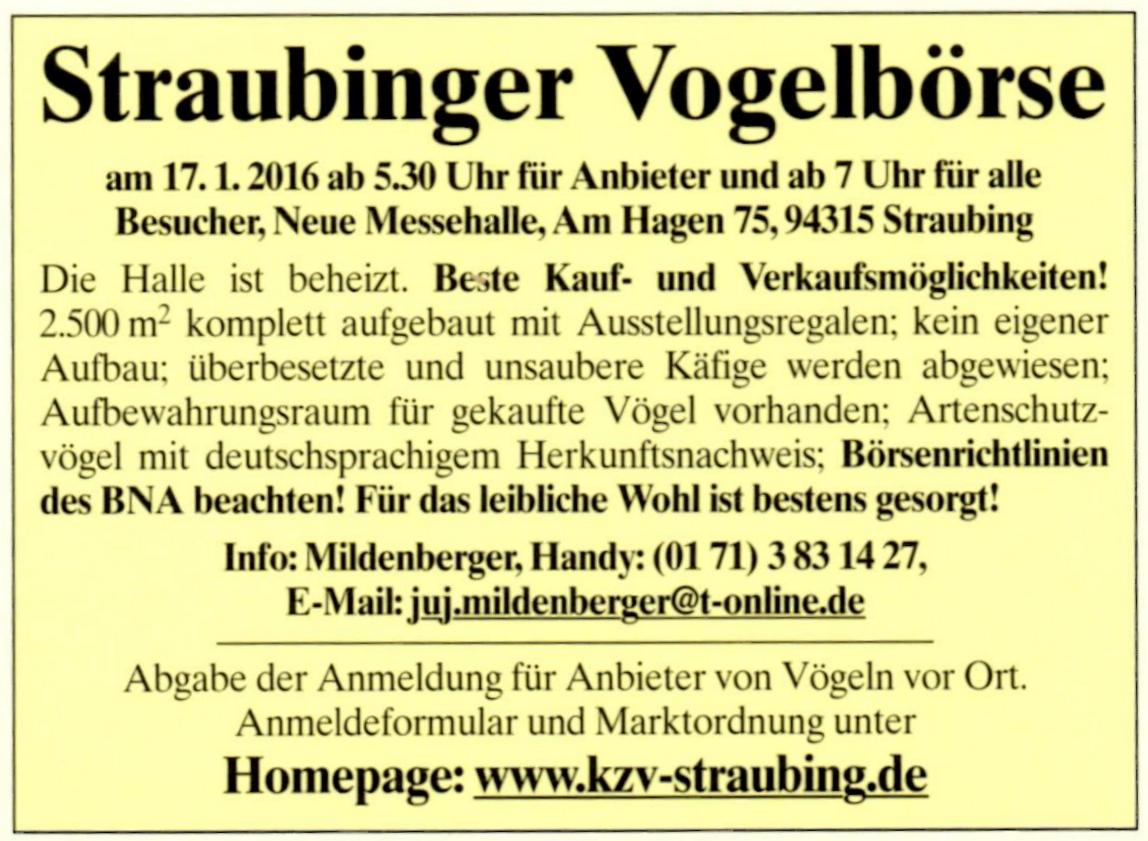 [size=150][color=#0080BF]Ближайшие рынки в городе[b] Straubing [/b][/color] [/size] [b][size=150]6 декабря 2015 г.[/size][/b] - с 7 до 12 часов. Площадь рынка - 2500 кв.м. Большой выбор птиц, сопутствующих товаров и кормов. Рынок будет проводиться под контролем ветеринарных служб. [u]Куры, голуби и водоплавающие птицы к продаже на этом рынке не допускаются![/u] [b][size=150]17 января 2016 г.[/size][/b] - открывается с 5.30 для продавцов и с 7 часов для покупателей. Площадь рынка -2500 кв.м. Проводится в отапливаемом помещении нового выставочного зала. Адрес рынка: Am Hagen 75, 94315 [b]Straubing[/b], Germany. Тема :arrow: [url=http://gularis.com/forums/viewtopic.php?f=104&t=636&p=6714#p6714]Птичий рынок в Штраубинг (Straubing), Германия[/url] Домашняя страница [url=http://www.kzv-straubing.de/]Straubinger Vogelbörse[/url][attachment=1]img019.jpg[/attachment] [attachment=0]img017.jpg[/attachment]
