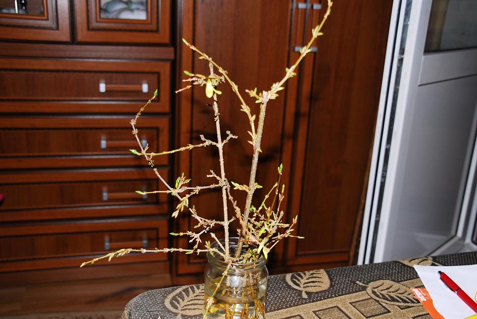 Увидев фотографии форзиции вспомнил что и у нас за домом растёт такой кустик. В субботу пошёл на разведку и обнаружил под кустом обрезанные и пока не убранные ветки. Набрал не много для пробы. Засунул в банку с водой из под крана.