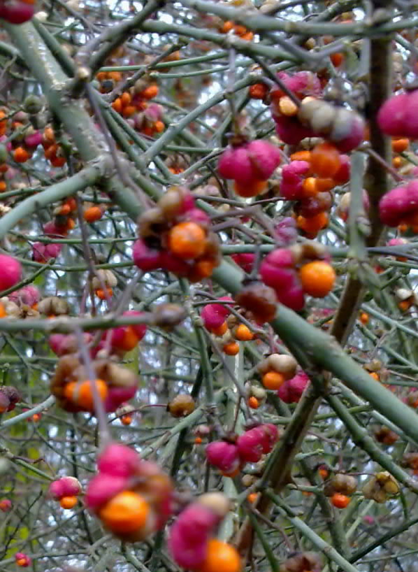 Опаньки! Тут еще и третья страница! то что выше - бересклет европейский, вырастает в маленькое дерево. Если не опрыскивать, сильно поражается чёрной тлёй,если кому нужна. Семена зимой съедят свиристели и снегири, при условии,что больше нечего. Это не наш вид европейской части России, хотя распространён повсеместно. Наш - родной: бересклет бородавчатый, кустарник, ствол усеян мелкими бородавками. Плоды редкие на длинных ножках, как серёжки. Посмотрите отличие: ну, и как фото тут вставлять? идите по ссылке....... БЕРЕСКЛЕТ(EUONYMUS) сем. Бересклетовые обратите внимание на чёрный глазок из околоплодника.