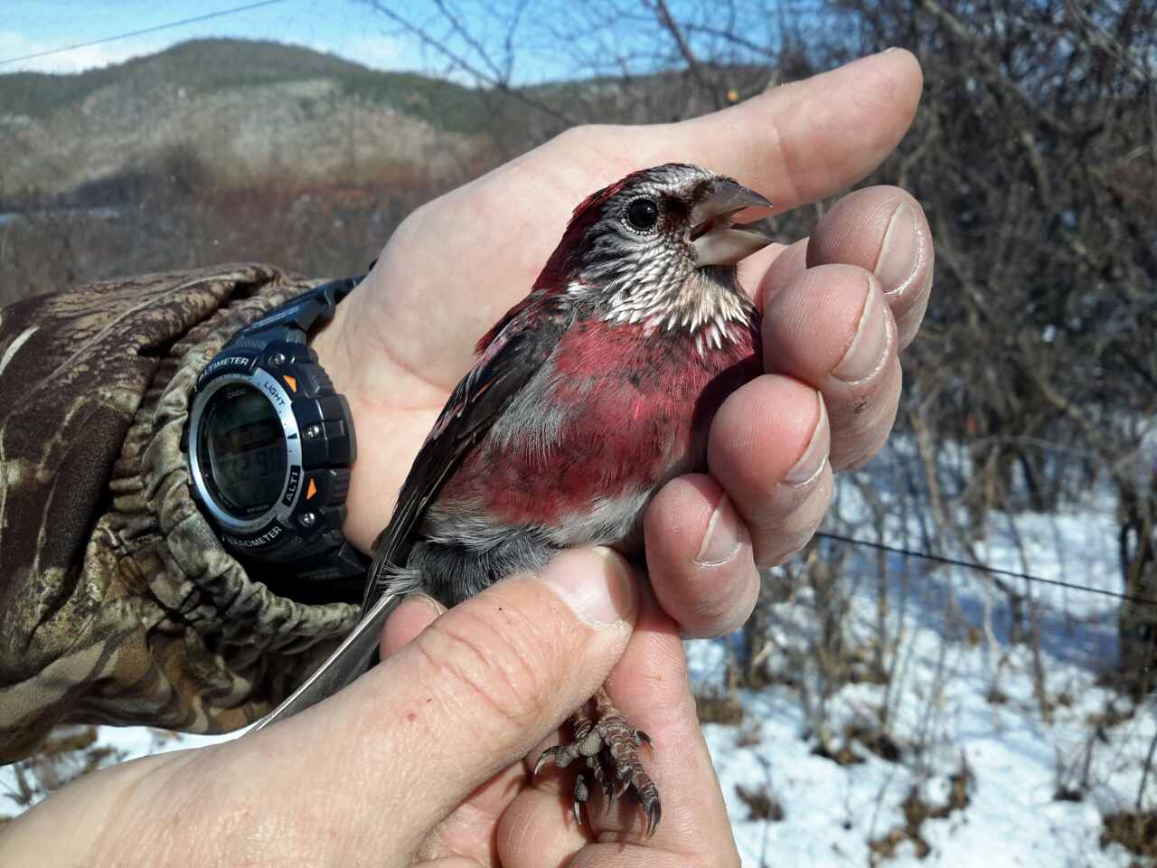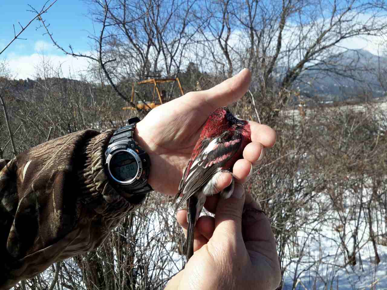 Искали мы ее давно. Но поиски долгое время были безрезультатными. В разные сезоны обследовали окрестности города Лицзяня. Постоянно проигрывали ее голос во время поисков. Делали контрольные отловы, но всё - увы, без успеха. Впоследствии, продвигаясь дальше в Тибет, так же внимательно просматривали окрестности, пытаясь в бинокль увидеть в каждой чечевице характерные этому виду белые полосы на крыльях. И хотя китайские коллеги в своих скупых сообщениях указали, что зимой она довольно редка, первую птицу мы встретили именно зимой. Это была самка, пойманная при одном из контрольном отлове. Позже мы использовали ее в качестве манной птицы, но птица молчала как "партизан", хотя была довольно контактной, спокойно вела себя в западке и сразу и с удовольствием взялась за предложенный зерновой корм. Погода в это время стояла теплая, снега в горах практически не было. Мы для себя решили, что при появлении снежного покрова эти птицы собьются в стайки и будут более доступными. И вот в самом конце зимы мы снова в горах. Две различные записи голоса этой птицы , взятые с xeno-canto, полное снаряжение и оборудование - и мы готовы продолжить эти поиски.