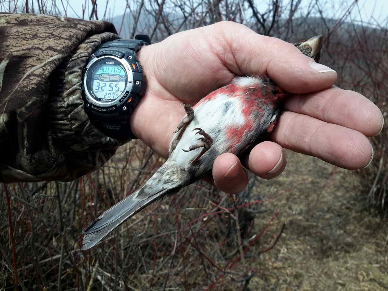 Снег начал падать на второй день, закрыв с утра всё белым покрывалом. И птиц стало, вопреки ожиданиям, не больше - а меньше. Она перестала посещать водопой. И только запись из наших звуковоспроизводящих систем оживляла округу. Появлялись уже знакомые нам птицы - арчовые дубоносы, белобровые чечевицы, яркие и эффектные белогорлые горихвостки, очень напоминающие своей окраской наших гулярисов, были, конечно, и птицы, которых не успевали определить или узнать. Мы охотились в долине реки, где заброшенные огороды переходили в сплошные кустарники, среди которых встречались и различные ягодные кусты. В какой-то момент меня тихонько подозвал напарник и указал на двух интересных птиц, кормящихся на верхушке невысокого куста. "О! Щуры!" - удивился я )). Взял бинокль и сделал несколько шагов вперед. Птицы не улетели, а переместились с макушек ближе к центру куста, затем скрывшись среди веток и колючек. Найдя снова их в бинокль - стало всё предельно ясно. Это были 2 самца трехпоясных чечевиц. Птицы смотрелись очень эффектно. Вели себя спокойно, а прятаться в кустах, где они кормятся - оказалось их характерным поведением. Голоса от них в этот день мы так и не услышали.