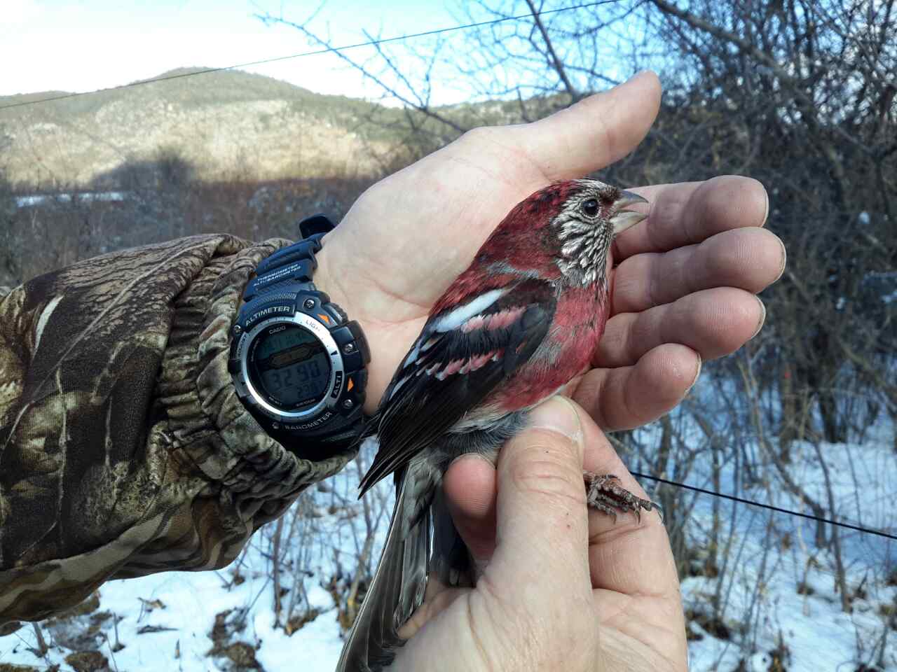 Утром было холодно. С гор в долину сполз плотный туман. Сети превратились в снежный забор. Короче, всё было против нас. Всё, как обычно в горах, быстро поменялось. Удалось с трудом выхватить одну пару. Но и это для себя мы посчитали большим успехом. Стало понятно - где, когда надо искать этих птиц. Кстати, встретили мы их на 3300 метрах. Хотя везде пишется, что зимуют они на более низких высотах - около 1800 м.