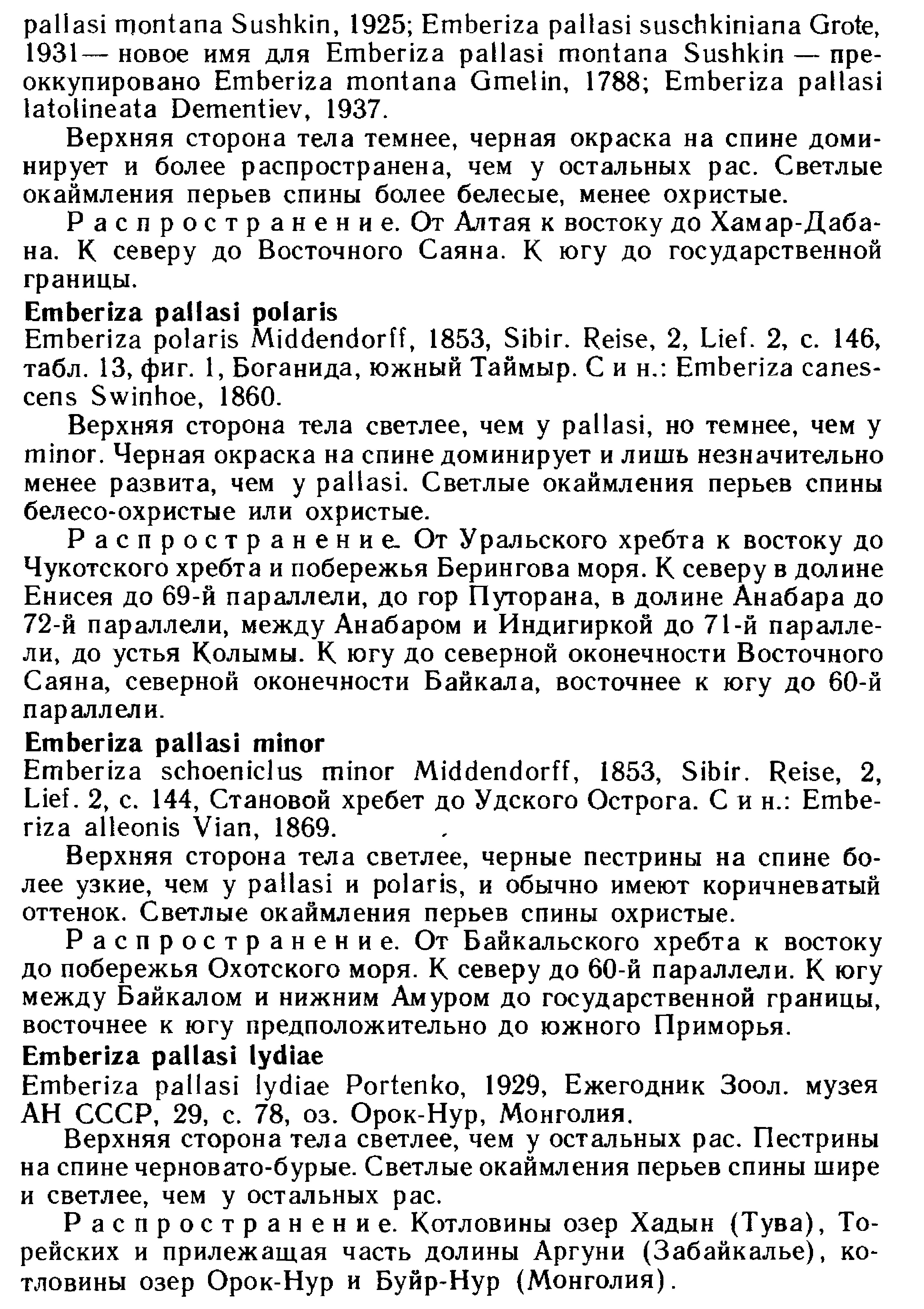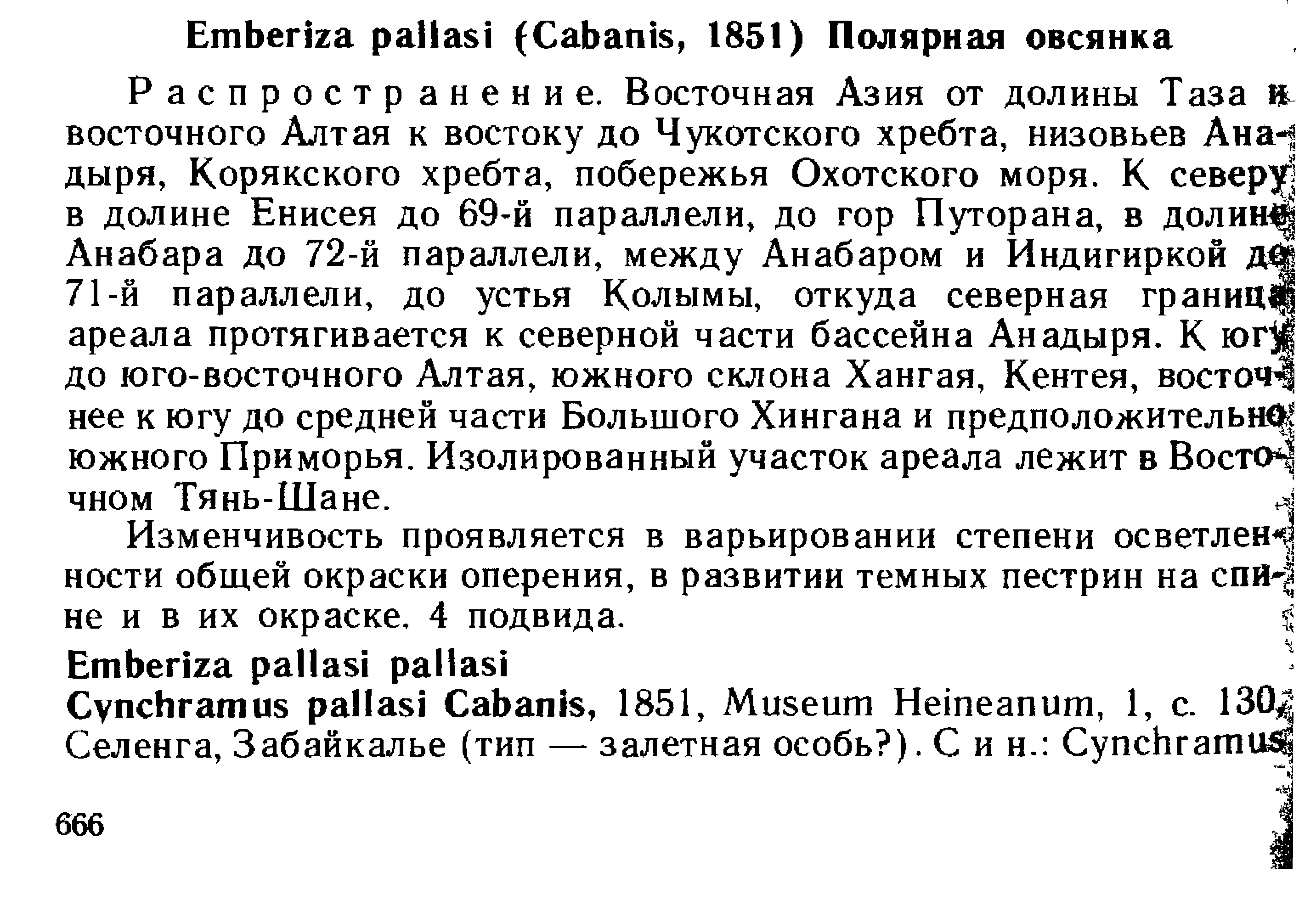 [rimg]http://ibc.lynxeds.com/files/imagecache/photo_940/pictures/019_Emberiza_pallasi.jpg[/rimg] Овсянка полярная [i](Emberiza pallasi)[/i] самец в брачном оперении озеро Байкал, Россия ©Stanislav Harvančík [rimg]http://ibc.lynxeds.com/files/imagecache/photo_940/pictures/PallasReedBunting-1077.jpg[/rimg] Овсянка полярная [i](Emberiza pallasi)[/i] самка, 1-я зима Хэбэй, Китай ©Mark Andrews[u]Подвиды и их распространение:[/u] - [i]polaris[/i] (Middendorff, 1853) - встречается на северо-востоке Европейской России, Восточной Сибири (юг бассейна реки Ангары, реки Лены и реки Алдан) на Чукотском полуострове, побережье Охотского моря и севере Камчатки; зимой на северо-востоке и востоке Китая, крайнем юго-востоке России (юг Уссурийского края) и Корее. - [i]pallasi[/i] (Cabanis, 1851) - встречается от Алтая и Саянских гор до восточного Забайкалья и западного Приамурья (южнее от горного хребта Тукурингра), на юге и севере Монголии, и северо-восточного Китая (северо-запад Хэйлунцзян), а также разобщенное распределение на восточном Тянь-Шане; зимой на западе и севере Китая (Синьцзян и Внутренняя Монголия). - [i]lydiae[/i] (Portenko, 1929) - обитает на севере Сибири (Тува и север Забайкалья), захватывая север, центр и восток Монголии, возможно, прилегающий северо-восток Китая (северо-восток Внутренней Монголии), на севере Китая вероятно не встречается.