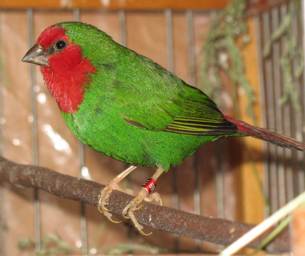 Самка окрашена так же, только красное оперение на голове и горле занимает меньшую площадь и не такое интенсивное, как у самца. | [attachment=0]КПА-07.jpg[/attachment][attachment=1]Красноголовая попугайная амадина.JPG[/attachment] |