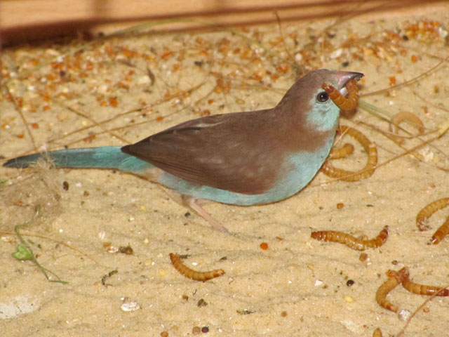 Кормить красноухого астрильда надо некрупным светлым просом, могаром, чумизой, пайзой. Вообще все мелкие сорта проса эти птицы предпочитают крупным. Часть зерна нужно давать в слегка проращенном виде. Летом следует разнообразить зерновой рацион птиц колосками мятлика и других дикорастущих, а по возможности и культурных злаков - в частности проса и могара. Многие особи охотно клюют увлажненную булку. Все теплое время года надо без ограничения давать нежную зелень салата и мокрицы. Зимой дают тертую морковь и белокочанную капусту. Красноухий астрильд - одна из тех птиц, которым особенно необходим животный корм, и притом не только в период размножения, но и зимой. Очень любит он свежего хорошо промытого мотыля и крупных дафний. Их ставят птицам в каком-нибудь мелком сосуде с небольшим количеством воды. Хорошо едят они белых личинок мучного хруща и его куколок, пока те еще мягкие, не загрубевшие. С крупными личинками хруща птицам трудно справляться, поэтому их лучше всего давать разрезанными пополам. Мелкие голые гусеницы и тли с листьев и стеблей растений - прекрасное летнее лакомство для этих птиц. Быстро привыкают они и к мелким свежим муравьиным куколкам, хорошо берут рубленое куриное яйцо. Песок и минеральная подкормка в виде толченой яичной скорлупы, глицерофосфата и глюконата кальция должны быть в клетке постоянно. Очень желателен также мелко толченый аптечный уголь.