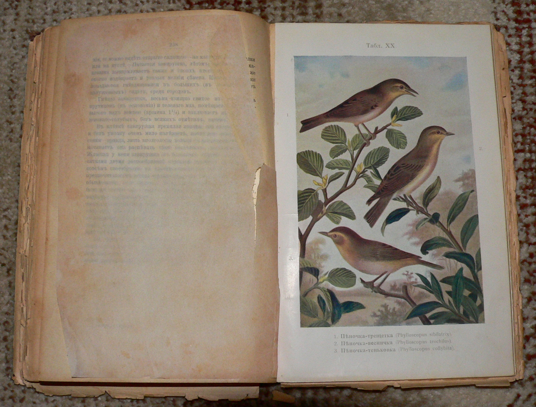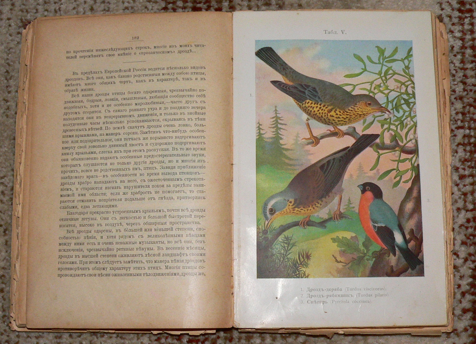 Из старых раритетных изданий -книга выдающегося русского орнитолога Дмитрия Кайгородова, издания 1908 года :!: , с черно-белыми рисунками и цветными иллюстрациями, фабрично бережно переложенными пергаментной бумагой. Обратите внимание, кому посвящена книга :) .