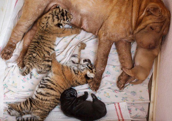 "Чтобы прокормить новорожденных тигрят из зоопарка санатория «Октябрьский» в Сочи, от которых отказалась мать, сотрудники зоопарка подсадили их к только что ощенившейся самке шарпея, которая нашлась через клуб кинологов."
