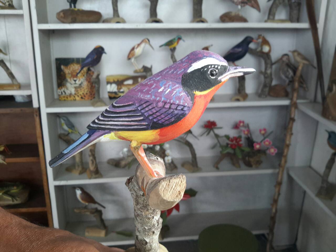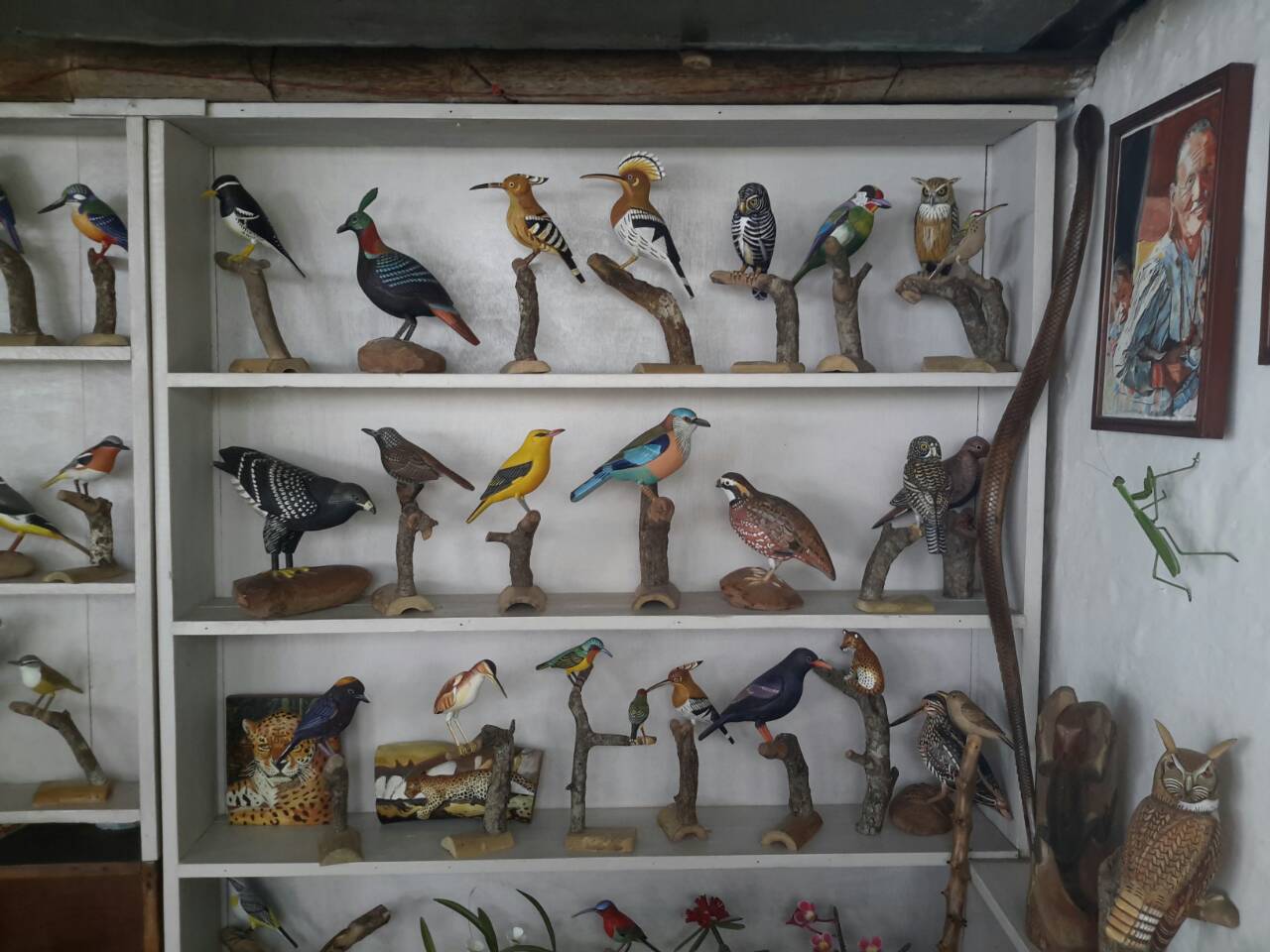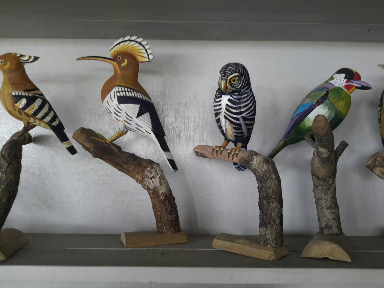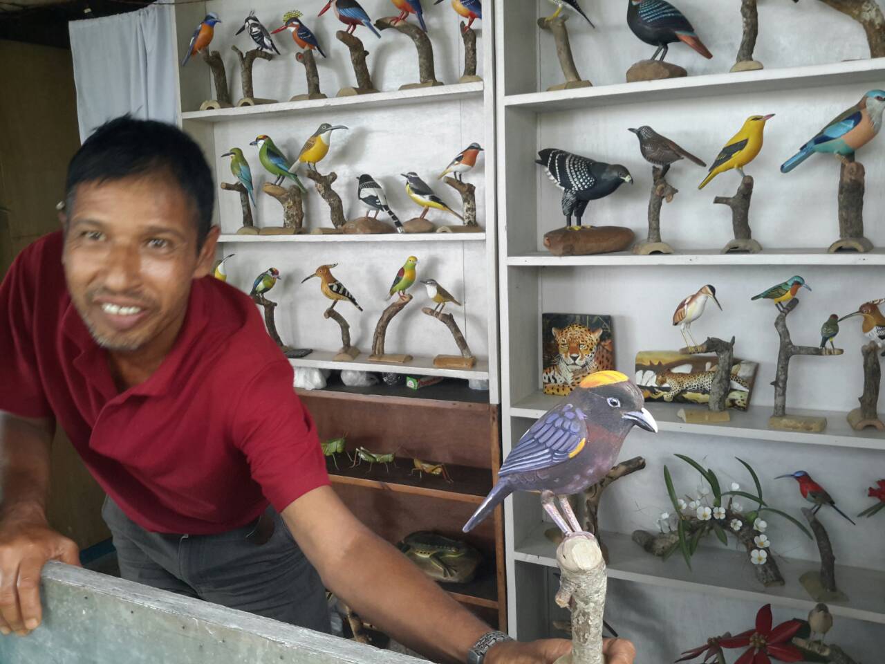 Далеко от столицы, в одной маленькой лавчонке , мы случайно встретили художника, на стенах у которого кроме картин стояло на полках много фигурок различных птиц, вырезанных из дерева. В большинстве своем они были сделаны в точную натуральную величину. Окрас птиц полностью соответствовал действительности. Каждую фигурку оживляли глаза...не знаю из какого материала они выполнены, но создавалась иллюзия живой птицы.Чувствовалось что мастер в теме и делает все с большой любовью и знанием. В разговоре выяснилось, что кроме своих наблюдений он так же использует цветные фотографии и описания из англо-язычной литературы.