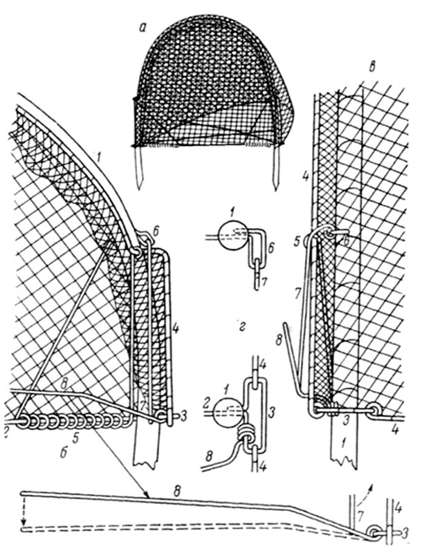 | Рис. Автолучок а — общий вид; б — настораживающий механизм спереди; в — то же сбоку; г — петли растяжки и пружины сверху. 1 — деревянная дуга; 2 — растяжка; 3 — петля растяжки; 4 — дужка; 5 — пружина; 6 — петля пружины; 7 — сторожок; 8 — насторожка. | [attachment=0]Автолучек.jpg[/attachment] |