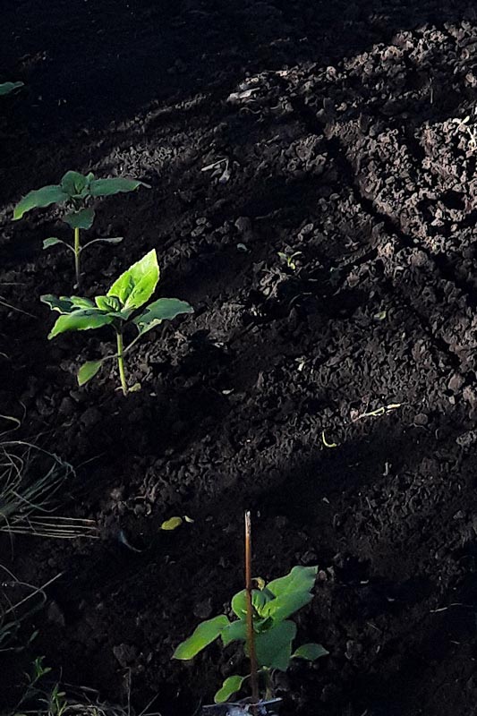 Мои подсолнухи "по-веселее" выглядят. Семян в пачках было не много, поэтому поместились все в одном ряду. При такой посадке, большинство растений "закустилось" - образовалось много боковых побегов, что обещает большее количество шляпок :?