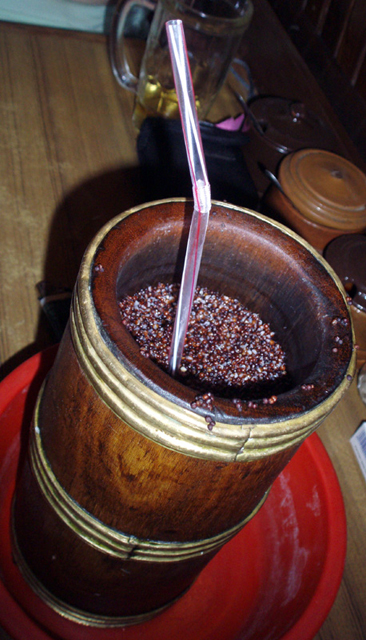 [i][size=150]- А вы любите тонгба? - Это потому что у Вас не умеют готовить тонгба![/size][/i] © Помимо того, что это, прежде всего кормовая культура, путем нехитрых манипуляций и легких движений рук, она может превращаться в спиртосодержащий напиток ;) С подобным использованием растения можно столкнутся в Непале, где Вам могут предложить выпить горячее просяное пиво - tongba. Зерна проса готовят, ферментируют и сушат. Сухую массу помещают в бамбуковые колбы с кипящей водой... Смесь нужно выдержать в течение нескольких минут, чтобы "пропарить". Соломка с зонтиком используется, чтобы высасывать воду и спирт из бражки. Теплый напиток имеет характерный кисло-сладкий вкус. Когда содержимое становится "сухим" - либо забилась трубочка, либо нужно добавить еще кипяточку… и процесс повторяется. Это не быстрый напиток! Процесс может длиться в течение нескольких часов, пока спирт не будет исчерпан (с учетом индивидуального потребления напитка). :drinks:[attachment=1]tongba1.jpg[/attachment][attachment=0]tongba2.jpg[/attachment]