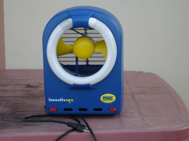 Изделие может иметь произвольные размеры, но схематически выглядит следующим образом: в расширенной части конуса устанавливается лампа, а в узкой части - вентилятор, далее находится накопитель для сбора насекомых. Насекомые летят на свет и вентилятором затягиваются в мешок. Насекомосос! Насекомых можно обездвижить в холодильнике, не вынимая из мешка, после чего скормить, либо высушить - сделав таким образом «заготовку» впрок.