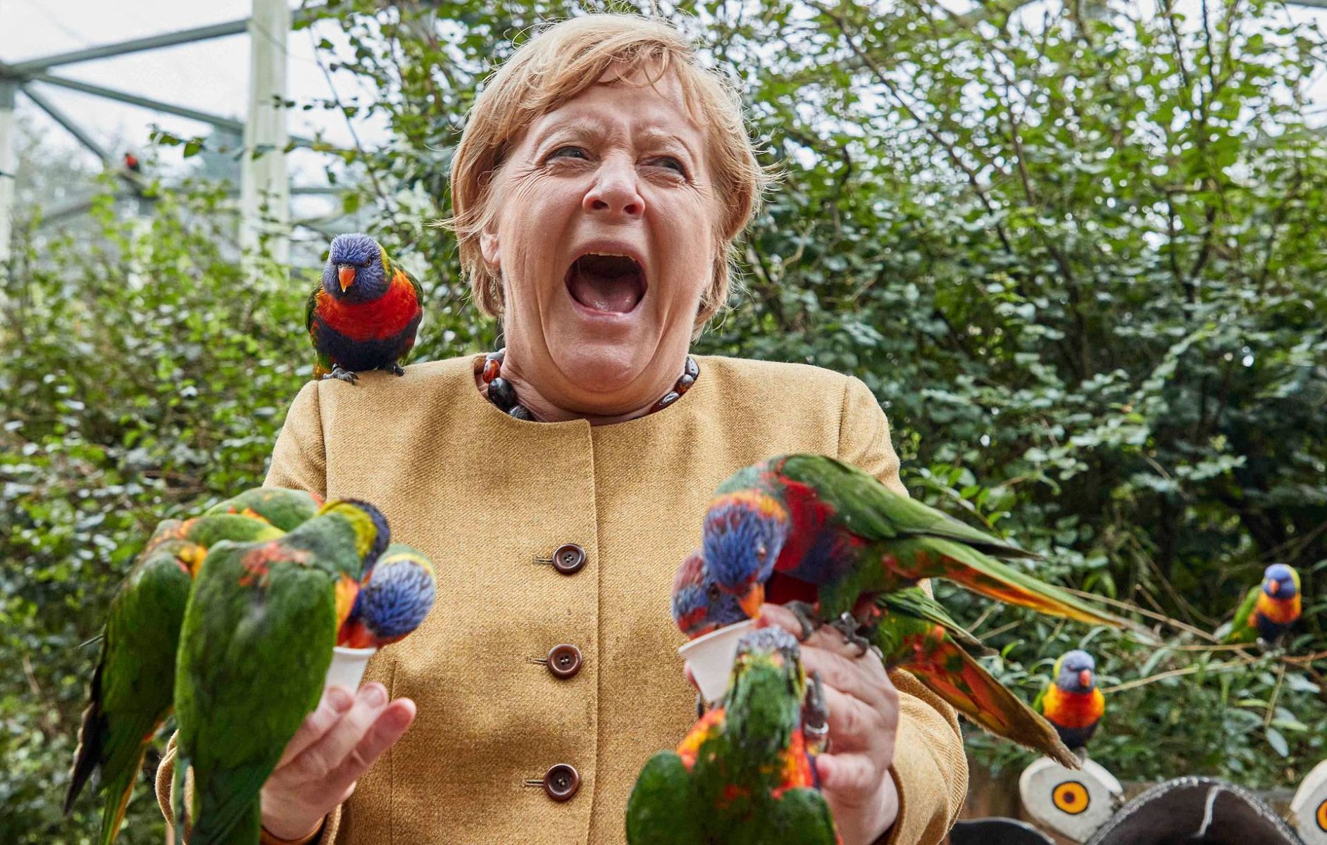 Меркель, в преддверии выборов в Бундестаг (назначены на 26 сентября) совершила поездку по своему бывшему избирательному округу. В ходе турне она среди прочего посетила парк птиц в Марлоу, где захотела покормить его обитателей. Меркель выдали бумажный стаканчик с кормом для птиц - так называемым нектаром лори, приготовленным из высушенной пыльцы, фруктозы, зерна и воды.