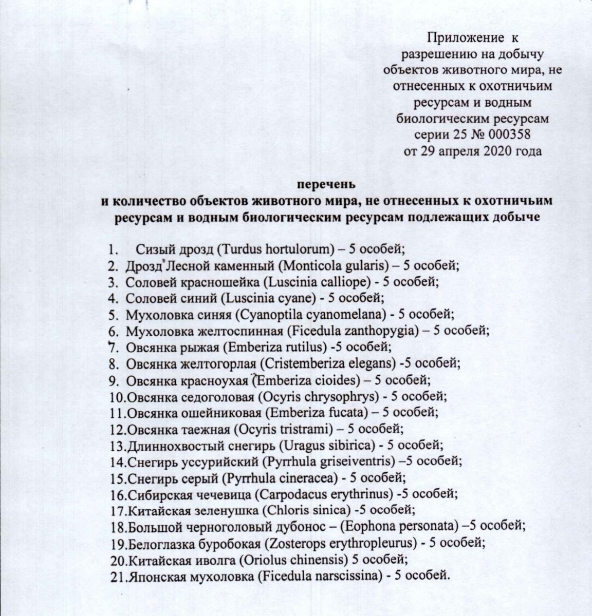 В этом году, как обычно, без особых проблем получили Разрешения на добычу объектов животного мира.....Приморского края.Все так Сергей, однако общая тенденция идет к полному запрету отлова птц, так что расслабляться не стоит.