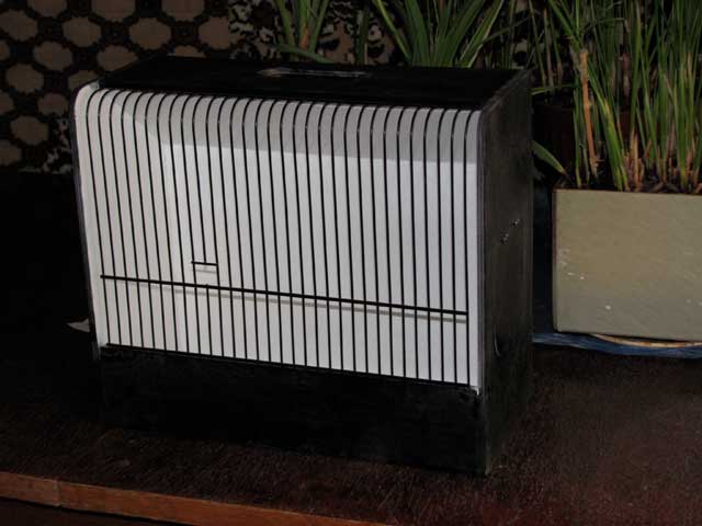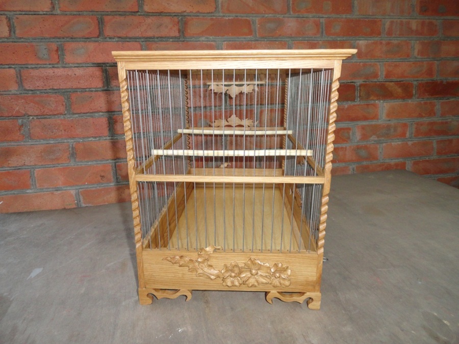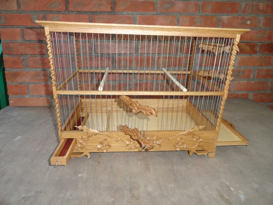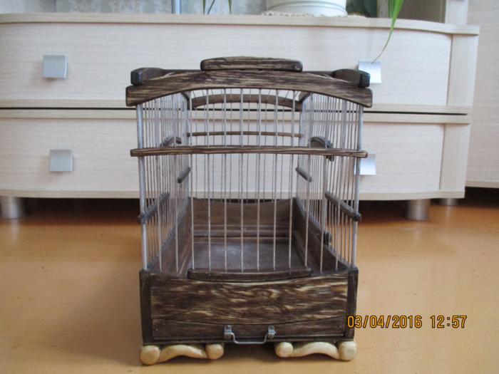 Собственноручная подделка под выставочные клетки на различных зарубежных выставках. Это не окончательный вид клетки. Окончательно их оформил "черный низ - белый верх", т.е. внутри выкрасил парой слоев обычной масляной белой краской, а снаружи покрыл морилкой и парой слоев лака. Вариант на фото больший, под травяных чуть меньшего размера. А вот точный размер не помню.