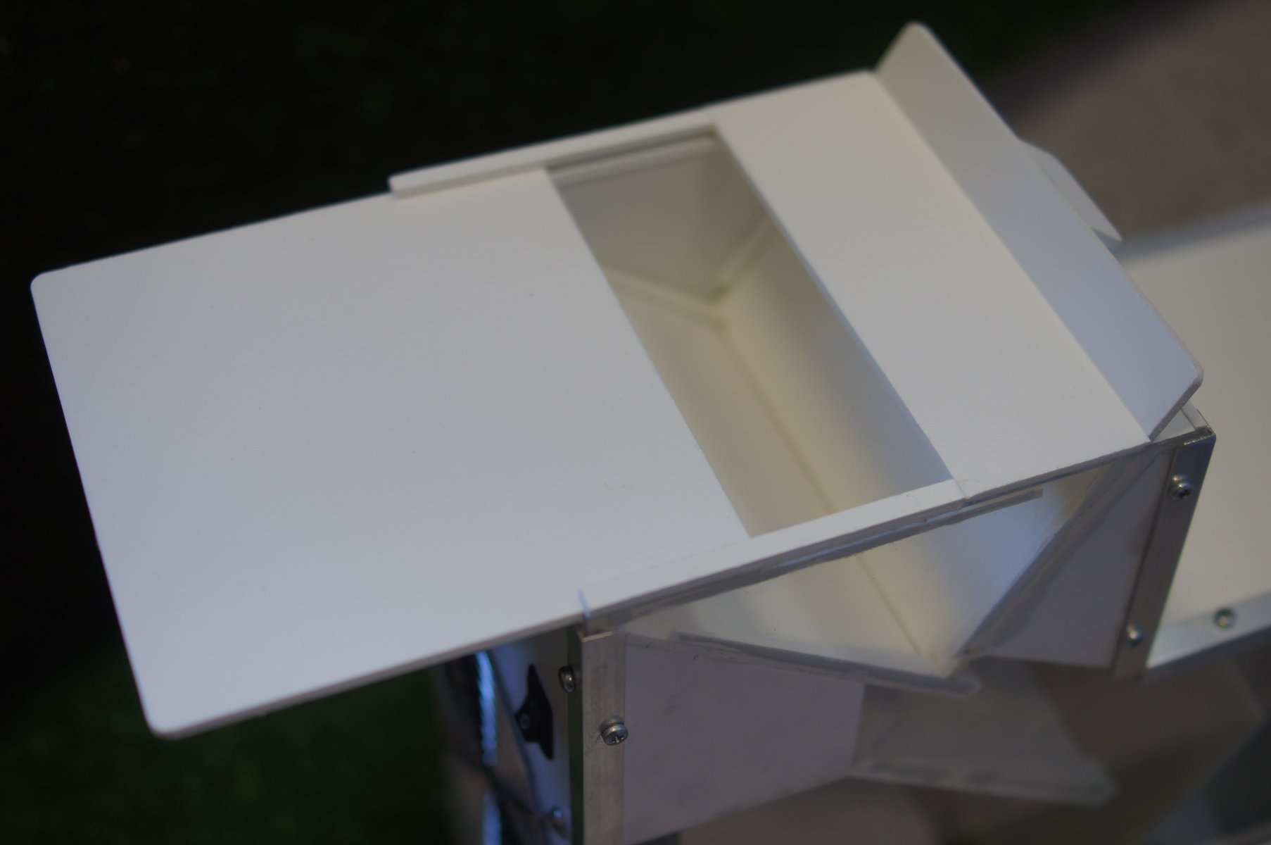 Со временем пришел к идее сделать кроме верхней крышки ещё и нижнюю, отделяющую место загрузки зерносмеси от рабочего пространства, где происходит очистка зерна. А так как это все сделано в едином корпусе, то получается вполне герметичная конструкция, которая позволяет засыпать зерносмесь и очистить её без появления грязи и пыли вокруг сепаратора.