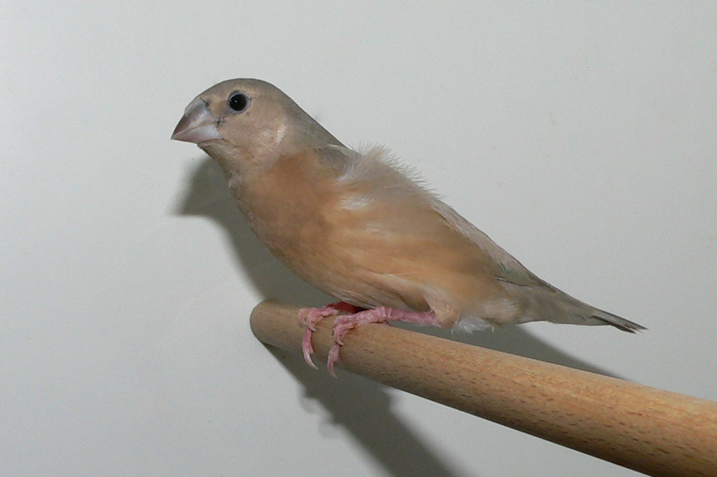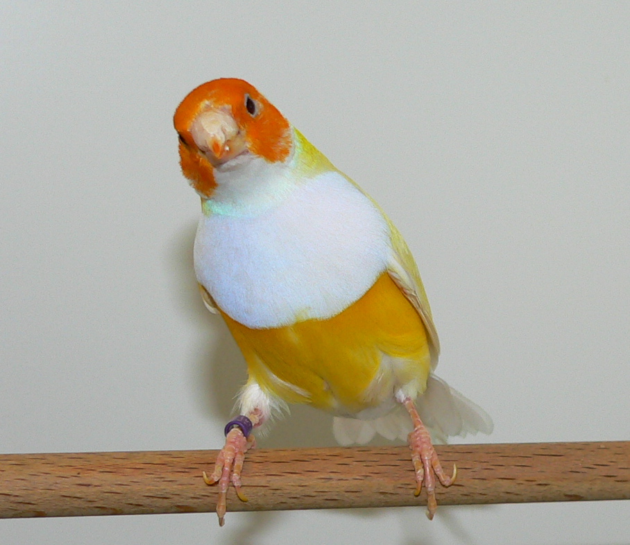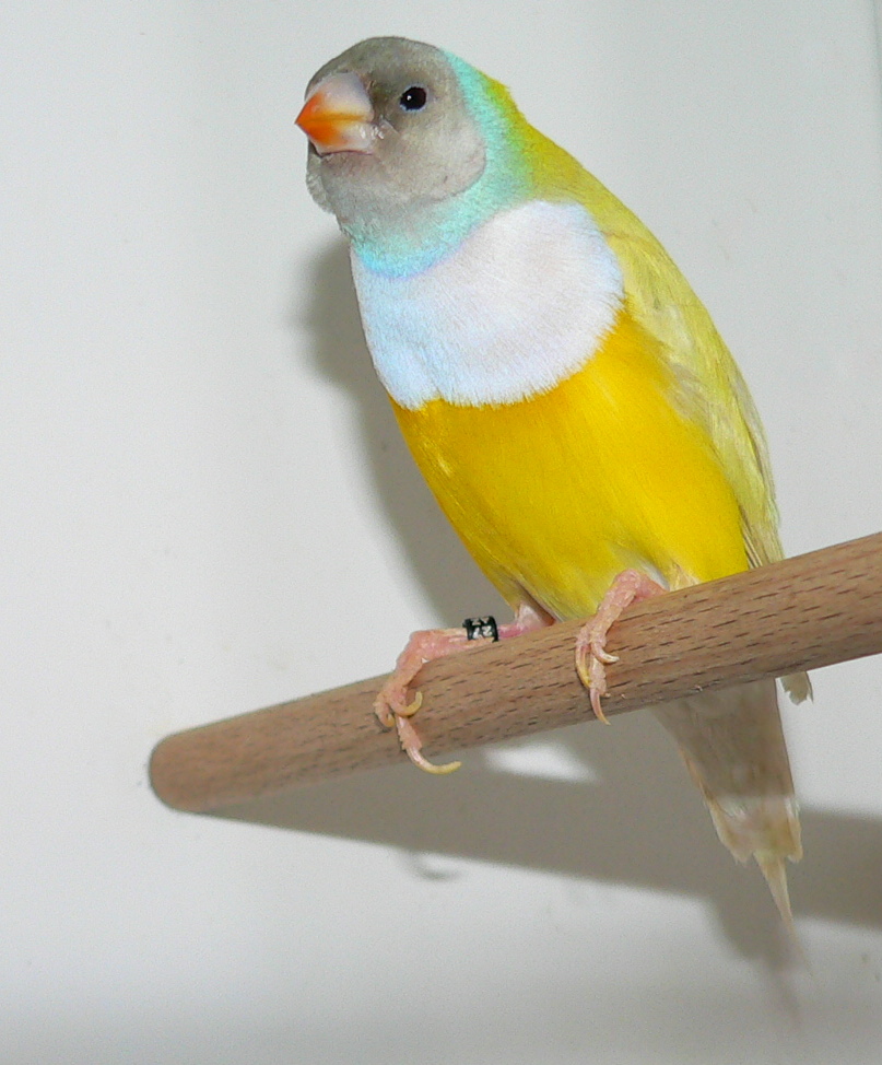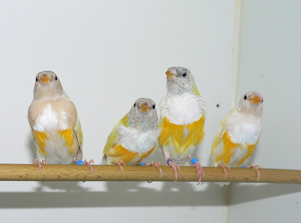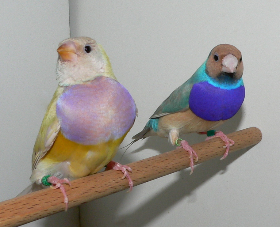 Молодые гульды от родителей дикого типа окраски полиняли отчасти, одна птица оказалась молодым синим самцом, одна самка имеет на границе желтого и сиреневого цвета пучки синих перьев, часть пигмента, как я понимаю, ушла и на желтые перья, отчего они кажутся грязными. :D