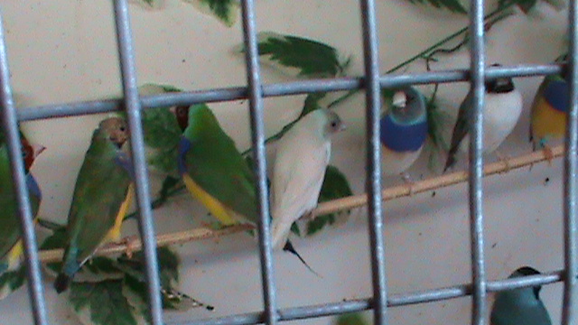 Периодически отправляю к гульдам на квартиру по одному по два попугая, так как у них квартира мала и у них разборки между собой. А этот прижился, встречает после гнездования друзей и подкармливает , живет с рождения .Осенью будет 1,5 года.