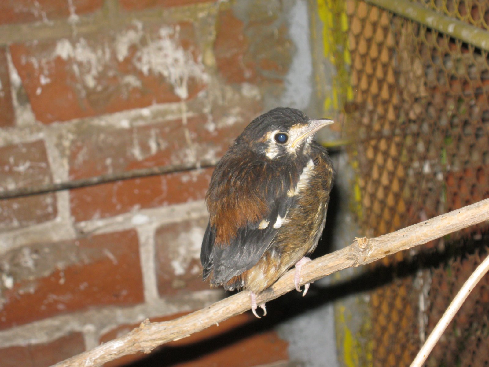 30 и 31.05. птенцы вылетели из гнезда. Судя по суточной периодичности вылета птенцов можно сделать вывод, что самка начинает насиживание с первого яйца, и поэтому птенцы получаются разновозрастными. За день до вылета птенцов я поменял купалку на поилку и выложил дно вольера ветками, чтобы птенцы не сидели на земле, а первое время использовали их как присаду, пока не научатся взлетать наверх. Кроме того, переднюю стенку вольера я завесил тонкими листами сотового поликарбоната, высотой в человеческий рост, а корм стал давать через нижний лючок. Такая предосторожность связана с тем, что первое время после вылета птенцы, завидев кого-либо, срывались с места и с силой бились о противоположную стенку вольера, часто погибая при этом. И только лишь после того, как птенцы «обживут» верхнюю часть вольера, можно убирать поликарбонат.