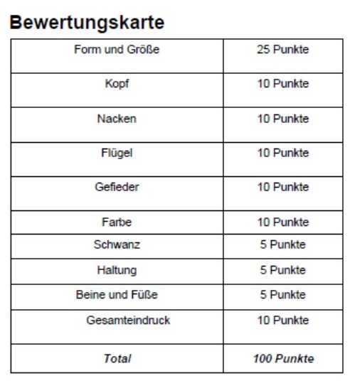 [attachment=1]12.jpg[/attachment][b][size=150][color=#404080]Оценочная карта.[/color][/size][/b] Форма и размер - 25 баллов Голова - 10 баллов Затылок - 10 баллов Крылья - 10 баллов Оперение - 10 баллов Окрас - 10 баллов Хвост - 5 баллов Осанка - 5 баллов Ноги и ступни - 5 баллов Общее впечатление - 10 баллов ----------------------------------------- Всего: 100 баллов