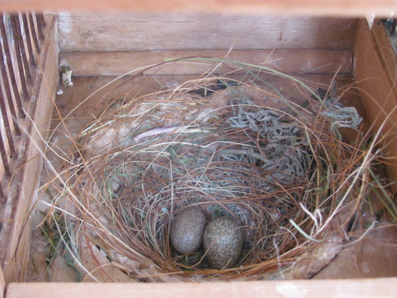 Было всего четыре кладки за год, первые две они выкинули яйца, третью она сделала на пол клетки, хотя после первого яйца я повесила им гнездовье и они начали его активно осваивать, на него в тот раз она не пошла.