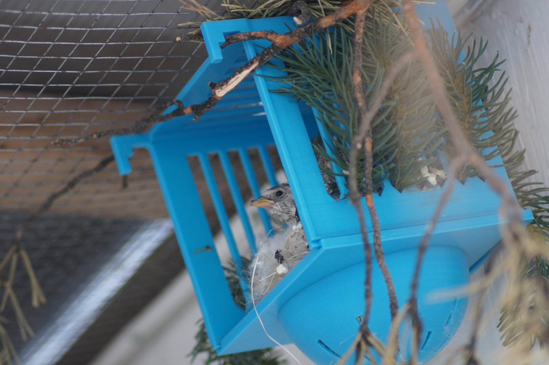 В этом году чечётки сделали такой же выбор, как и щеглы пару лет назад (до этого сезона не запускал чечёток в разведение). В вольере были гнездовой домик заводского изготовления с глухими стенками, открытая канареечная основа и этот синий, отпечатанный на 3D-принтере. Самка выбирала между открытой основной и синим. Итальянским домиком с глухими стенками даже не интересовалась. В конце концов сделала гнездо в синем домике.