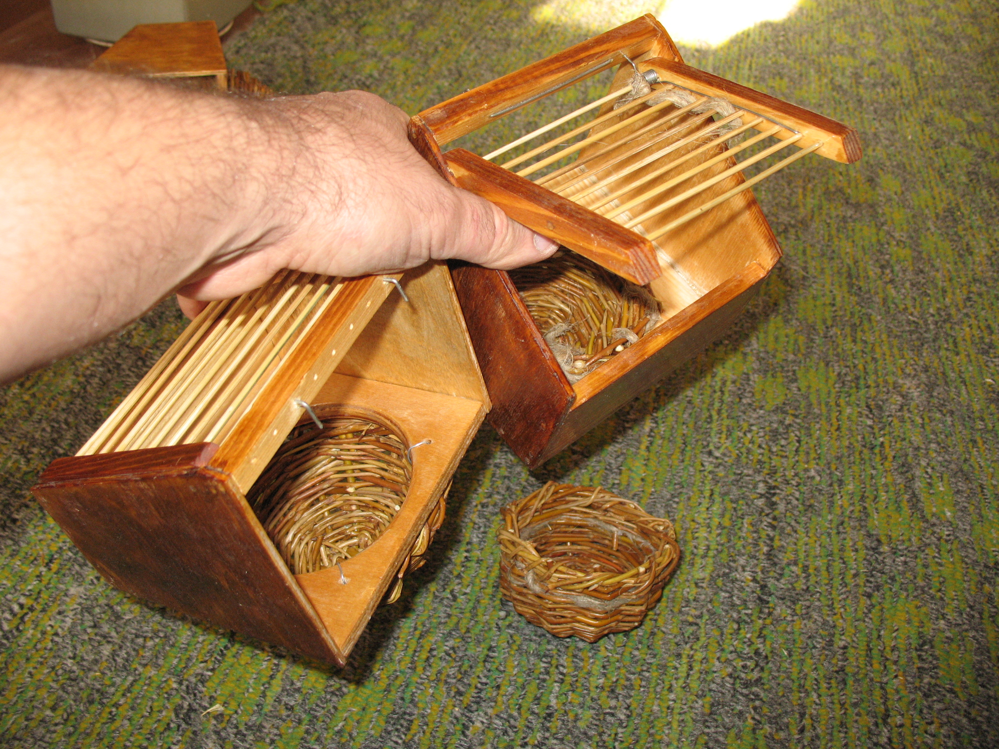 Эти самоделки для кит. соловьёв и предлагал ещё овсянкам. Если вторые принимали их почти всегда, то соловьи браковали каждый второй случай. Старались не принимать "подачки", приходилось протягивать под низ гнёзда что-то подобное.