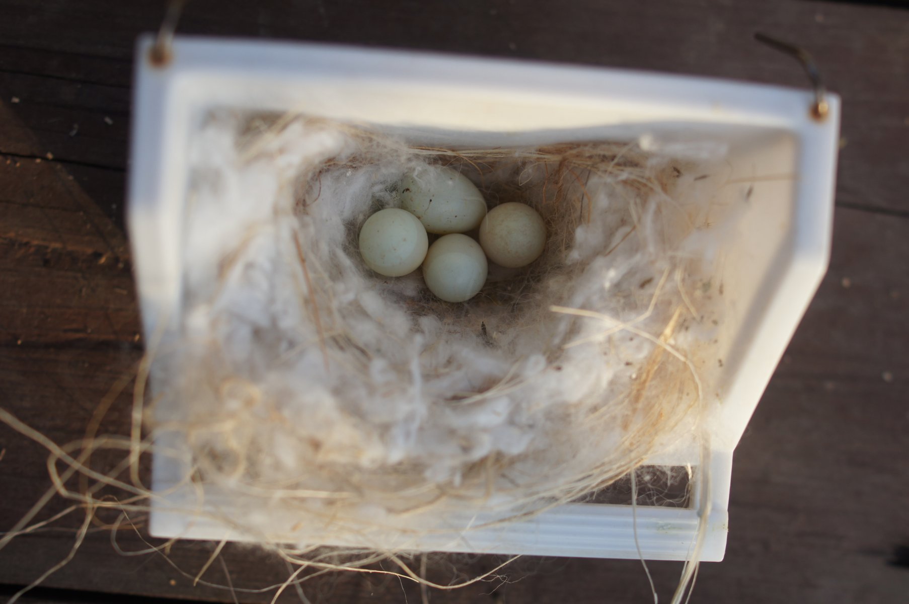 Чувствовалось, что ей что-то не нравится. Предложил открытую канареечную гнездовую основу, и дело пошло. Гнездо быстро было построено, вскоре появились яйца. Так и не понял, почему она не воспользовалась прошлогодней будочкой.
