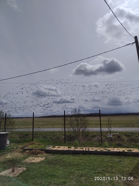 Погода не майская. На поля прилетели казарки (на фото не попали). Один день на поле держались кулики, стая пару тысяч голов (если правильно определил - бурокрылые ржанки), отдохнули, поднялись в облака и ушли. Гуси сегодня тоже вроде собрались лететь дальше. Из певчих рядом никого, только скворец тихоньку у скворечника поет.