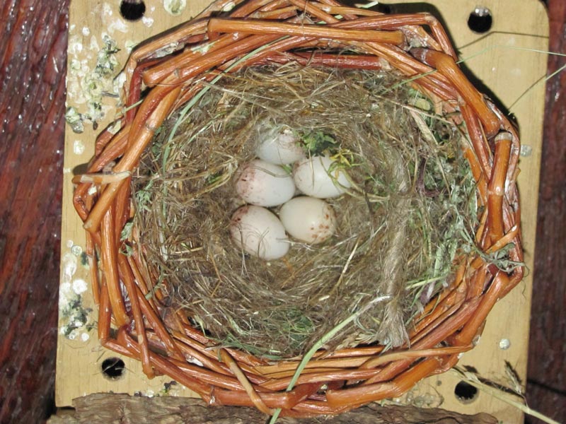 Это гнездо рыжей овсянки. Первый и последний раз, когда рыжая приняла такой каркас. В основном они не реагируют ни на какие формы гнезд. Гнездо из кокоса и немного травинки. Ни какой подстилки.