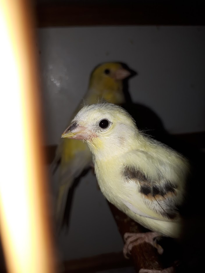 У меня возник вот такой вопрос: о возникновении пятен в окрасе канареек. Суть в том, что при разведении канареек одной линии, в которой много лет нет примеси зелёной или пятнистой птицы, даже в том случае, когда родители практически чисто лимонные (самец на фото без каких либо пятен), самка тоже такая же, но белясая (светло-жёлтая) в потомстве появляются птенцы с небольшими помарками (на фото один из птенцов) и птиц с большими зелёно-серыми участками на теле. Например, молодая самка с целым крылом другого цвета на фото. Есть примеры, когда хвост был целиком зелёно-серый, у другой птицы - спина. Как считаете, это случайно не мутации атавистического плана - возврат к признакам дикого предка при близкородственном скрещивании? Как к ним относится? Выбраковывать? А может это наоборот полезные признаки? Или это не значимые для певчей канарейки вариации и на них не стоит обращать внимание? Заранее признателен на высказанное мнение и описанный опыт.