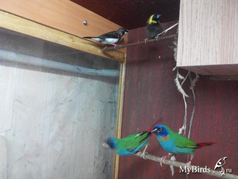 Виды птиц: яп. амадины, попугайные амадины, белоглазая аратинга, кардиналы
