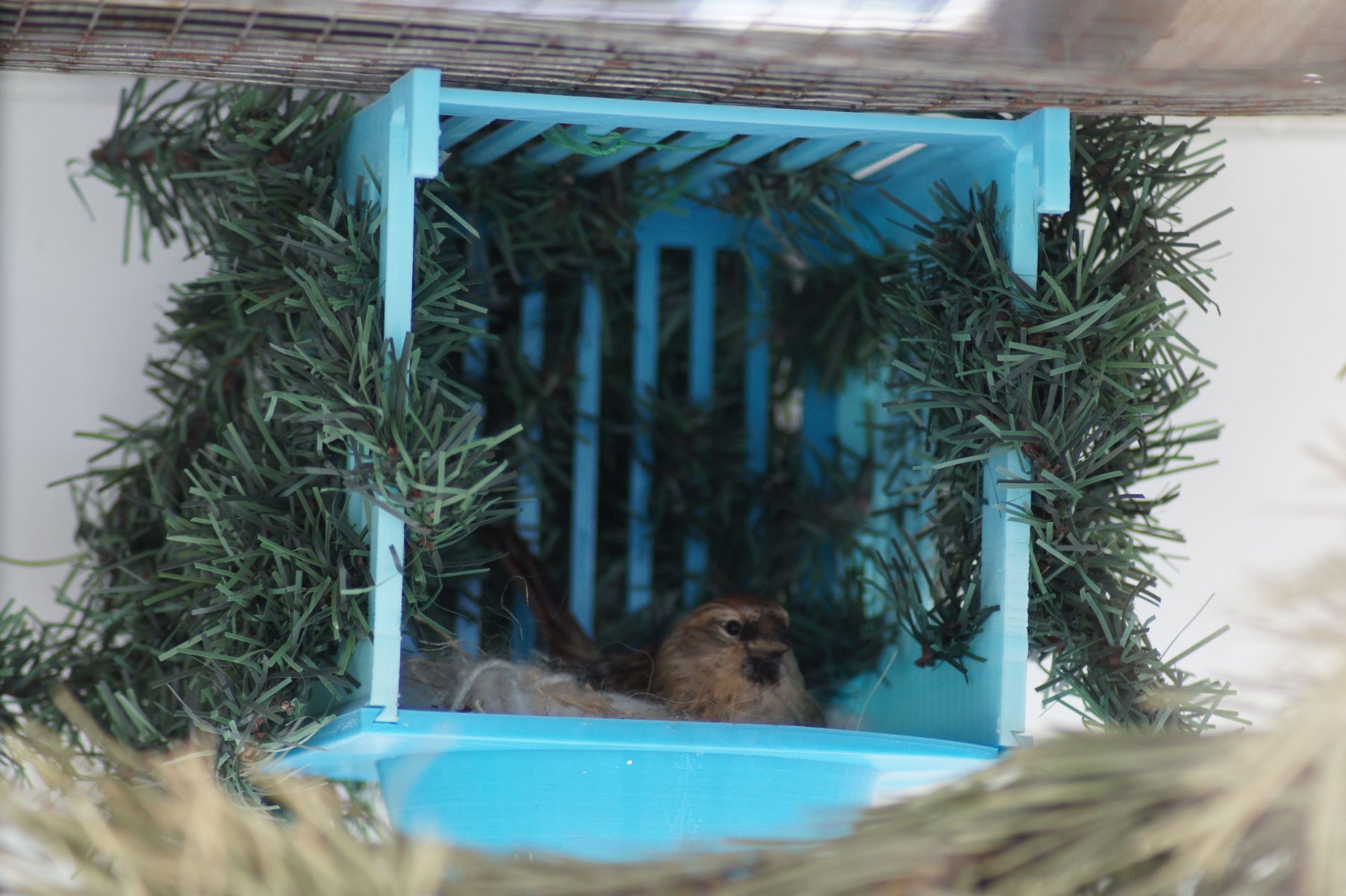 В этом году чечётки сделали такой же выбор, как и щеглы пару лет назад (до этого сезона не запускал чечёток в разведение). В вольере были гнездовой домик заводского изготовления с глухими стенками, открытая канареечная основа и этот синий, отпечатанный на 3D-принтере. Самка выбирала между открытой основной и синим. Итальянским домиком с глухими стенками даже не интересовалась. В конце концов сделала гнездо в синем домике.