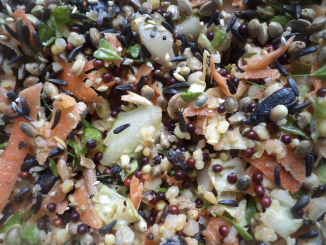 Рапс, семки, коноплю просто замачиваю с вечера, а пшено, гречку, кукурузу, рис смешиваю в равных пропорциях и в термос, заливаю кипятком и утром промываю и смешиваю с замоченными семенами, и конечно добавляю зелень, все что в данное время доступно: зимой - пекинская капуста, салат, морковка, весной - цветы форзиции, летом - одуваны, пастуш. сумка, осенью - мокрица.