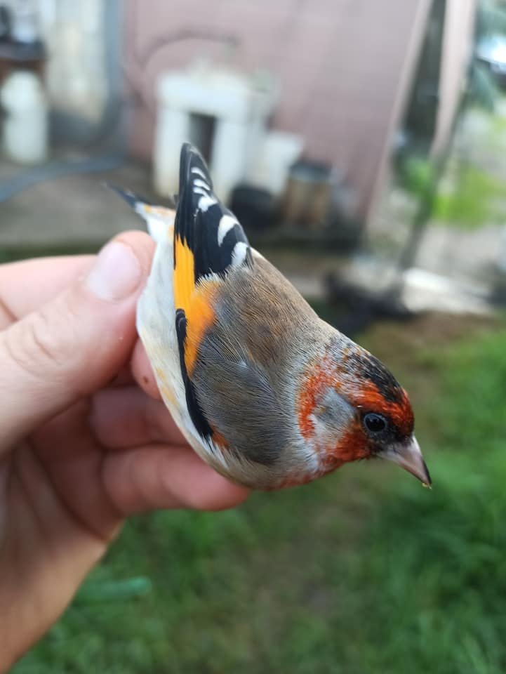 А вот такая интересно окрашенная птица получилась от пары Щегол обыкновенный Х Огненный чиж.